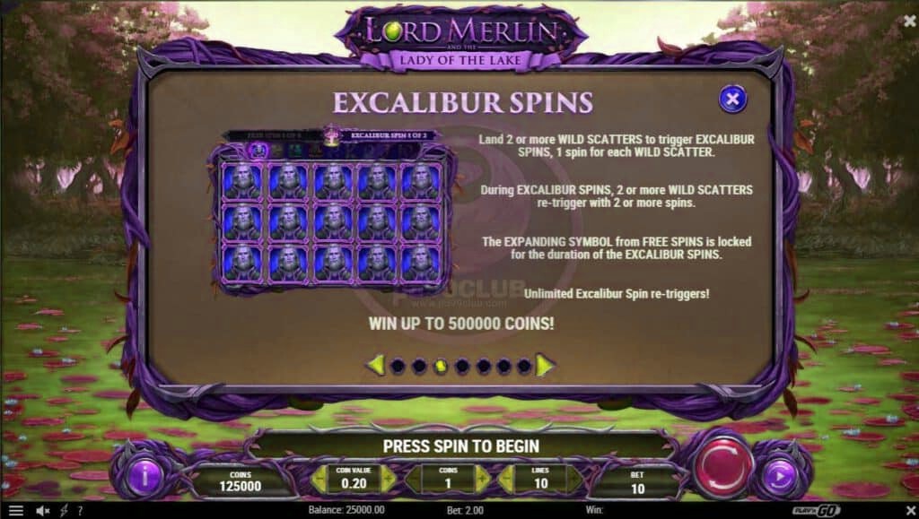 - หมุนให้ Wild Scatter 2 อันขึ้นไป ปรากฏขึ้นเพื่อเริ่ม Excalibur Spins ซึ่งการหมุน 1 ครั้ง สำหรับ Wild Scatter เเต่ละอัน