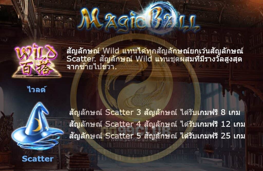 เป็นอีกหนึ่งเกมส์สล็อตทีู่้เล่นชอบแล่นอันดับท็อปๆ ของประทเศไทยตัวเกมส์มีให้ลุ้นทั้งโบนัสแจ็คพ็อตและฟีเจอร์ฟรีสปินโดยรูปแบบของเกมส์นี้มาในแบบเวทมนต์ แฟนตาซี ชวนให้คุณหลงไหลไปกบลูกแก้ววิเศษที่สามารถมองเห็นอนาคตได้ให้อยู่ใกล้เพียงแค่เอื้อม โดยแต่ละลูกมีลักษณ์แตกต่างกันออกไปบางลูกสามารถมองเห็นอนาคตได้ บางลูกนำเงินทองไหลมาเทมา บางลูกก็นำความโชคดีลาภที่ตกจากฟากฟ้ามาให้ซึ่งเกมส์ๆนั้นจะเป็นเกมส์ไหนไม่ได้นอกจากเกมส์ Magic ball สล็อตลูกแก้ววิเศษของค่าย amb988 โดยเกมส์นี้มีทั้งหมด 30 เพลย์ไลน์ 5 รีล และสามารถทำเงินรางวัลได้แต่การสปินครั้งแรก ตัวเกมส์เนื้อเรื่องน่าค้นหาและน่าสนใจเป็นอย่างมาก ทุนน้อยสมควรต้องเล่นเป็นที่สล็อตเป็นสล็อต เว็บใหญ่ ที่ติดอันดับ 1 ของเมืองไทยปี2020 เกมส์สล็อตลูกแก้วพิเศษนี้มีรางวัลให้ลุ่นตัวคูณสูงสุด 5 เท่าโดยแม้หมุนสล็อตแค่เพียงครั้งแรกตรงกับเส้นเพลย์ไลน์จะได้รางวัลเพิ่มขึ้นอีก 1 เท่า ไปชมสัญลักษณ์กลเม็ดการเล่นเกมส์และวิดีโอแนะนำเกมส์กันเลยค่ะ