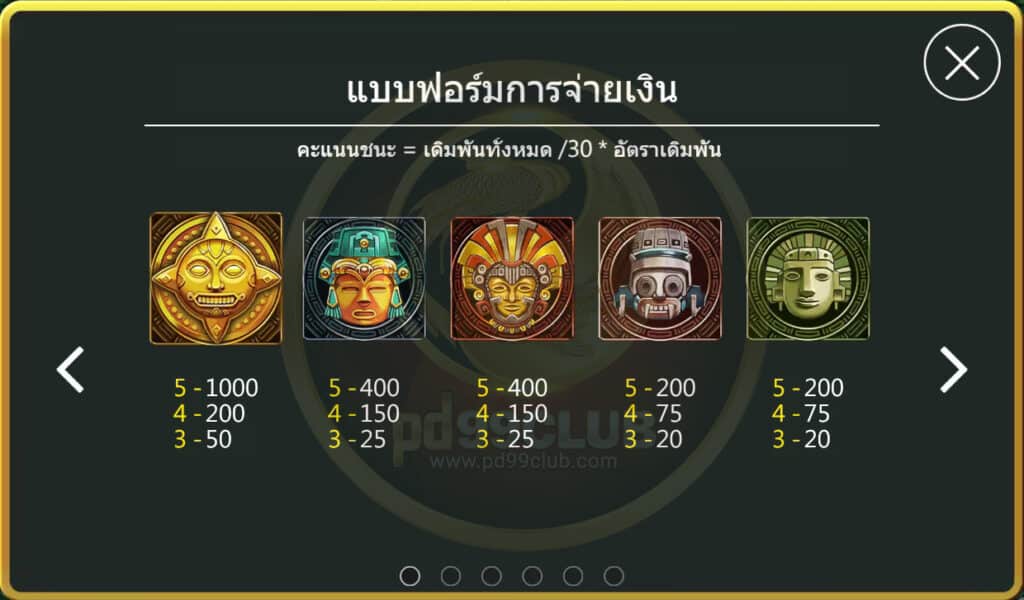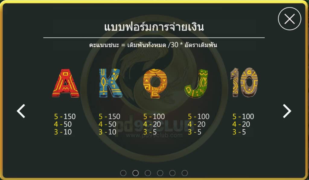 มีทั้งหมด 10 สัญลักษณ์ คะแนนชนะ=เดืมพันทั้งหมด/30*อัตราเดิมพัน