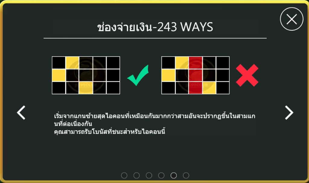 มีทั้งหมด 243 ไลน์เดิมพัน (เเบบคงที่) เริ่มจากแกนซ้ายสุดไอคอนที่เหมือนกันมากกว่าสามอันจะปรากฏขึ้นในสามแกนที่ต่อเนื่อง คุณสามารถรับโบนัสที่ชนะสำหรับไอคอนนี้