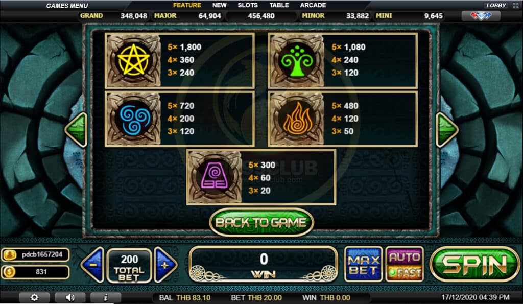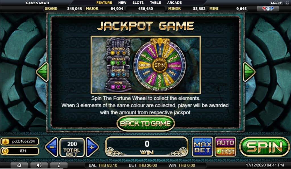 สัญลักษณ์ Jackpot Game หมุนวงล้อแห่งโชคชะตาเพื่อรวบรวมองค์ประกอบ เมื่อรวบรวม 3 องค์ประกอบที่มีสีเดียวกันผู้เล่นจะได้รับรางวัลเป็นจำนวนเงินจากแจ็คพอตตามลำดับ