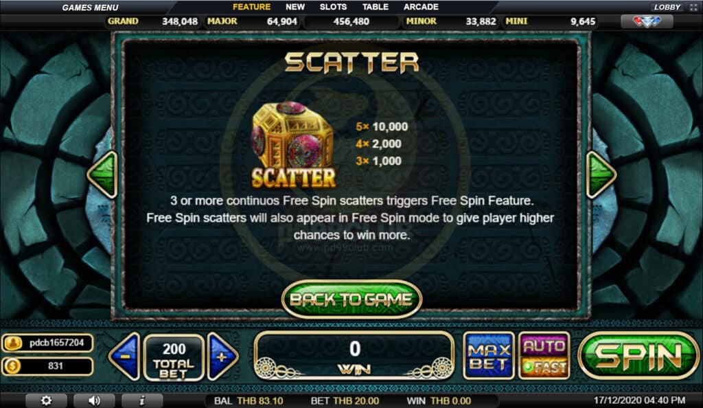 สัญลักษณ์ Scatter 3 หรือมากกว่าอย่างต่อเนื่อง Free Spin scatters เรียกใช้ Free Spin Feature Free Spin scatters จะปรากฏในโหมด Free Spin เพื่อให้ผู้เล่นมีโอกาสชนะมากขึ้น