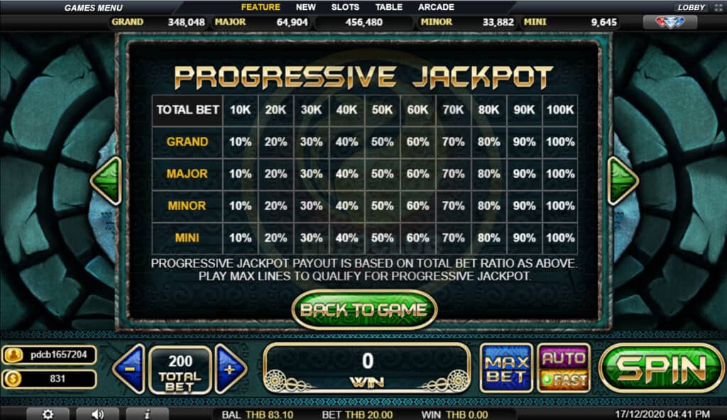 สัญลักษณ์ Progressive Jackpot การจ่ายเงินแจ็คพอตแบบก้าวหน้าขึ้นอยู่กับอัตราส่วนการเดิมพันทั้งหมดที่กล่าวมา เล่น MAX LINES เพื่อคุณสมบัติสำหรับแจ็คพอตที่ก้าวหน้า