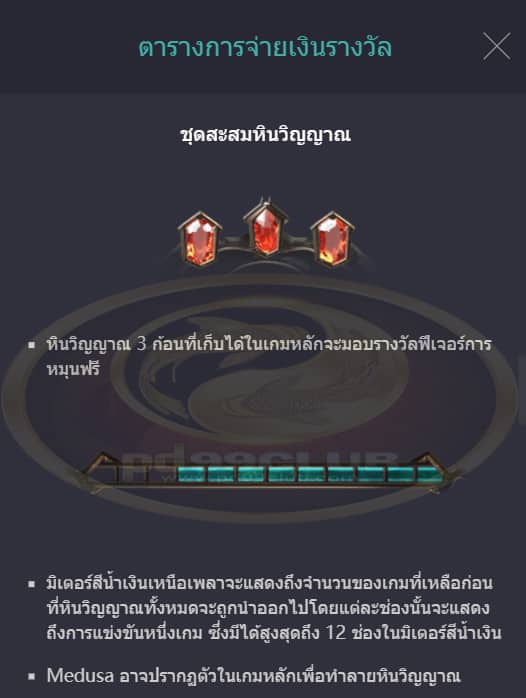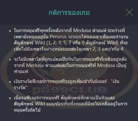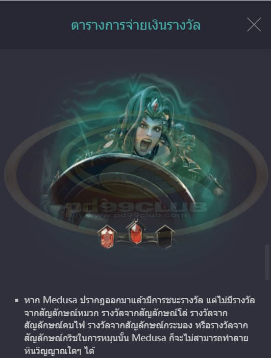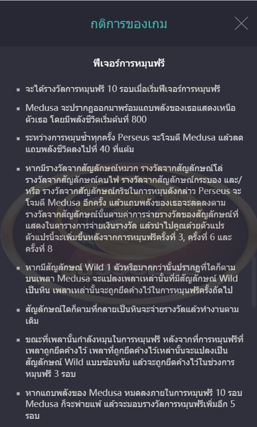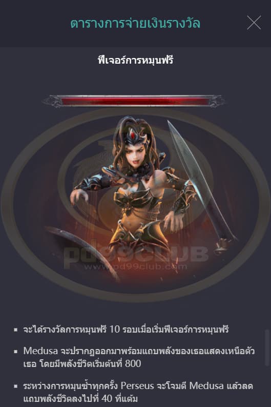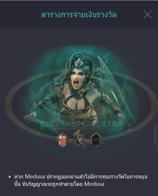 - หากแถบพลังของ Medusa หมดลงภายในการหมุนฟรี 10 รอบ Medusa ก็จะพ่ายแพ้แล้วจะมอบรางวัลการหมุนฟรีเพิ่มอีก 5 รอบ