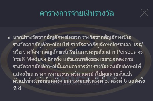 - หากมีรางวัลจากสัญลักษณ์หมวก รางวัลจากสัญลักษณ์โล่ รางวัลจากสัญลักษณ์คบไฟ รางวัลจากสัญลักษณ์กระบอง และรางวัลจากสัญลักษณ์กริชในการหมุนดังกล่าว Perseus จะโจมตี Medusa อีกครั้ง แล้วแถบพลังของเธอจะลดลงตามรางวัลจากสัญลักษณ์นั้นตามค่าการจ่ายรางวัลของสัญลักษณ์ที่แสดงในตารางการจ่ายเงินรางวัล แล้วนำไปคูณด้วยตัวแปรๆนี้ จะเพิ่มขึ้นหลังจากการหมุนฟรีครั้งที่ 3 ครั้งที่ 6 และครั้งที่ 8
