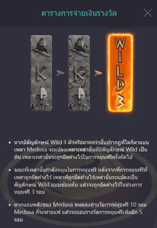 - หากมีสัญลักษณ์ Wild 1 ตัวหรือมากกว่านั้นปรากฏที่ใดก็ตามบนเพลา Medusa จะแปลงเพลาเหล่านั้นที่มีสัญลักษณ์ Wild เป็นหิน เพลาเหล่านั้นจะถูกยึดค้างไว้ในการหมุนฟรีครั้งถัดไป