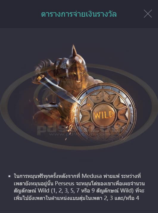 - ในการหมุนฟรีทุกครั้งหลังจากที่ Medusa พ่ายเเพ้ระหว่างที่เพลายังหมุนอยู่นั้น Perseus จะหมุนโล่ของเขาเพื่อเผยจำนวนสัญลักษณ์ Wild (1,2,3,5,7 หรือ 9 สัญลักษณ์ Wild) ที่จะเพิ่มไปยังเพลาในตำแหน่งแบบสุ่มในเพลา 2,3 และ 4