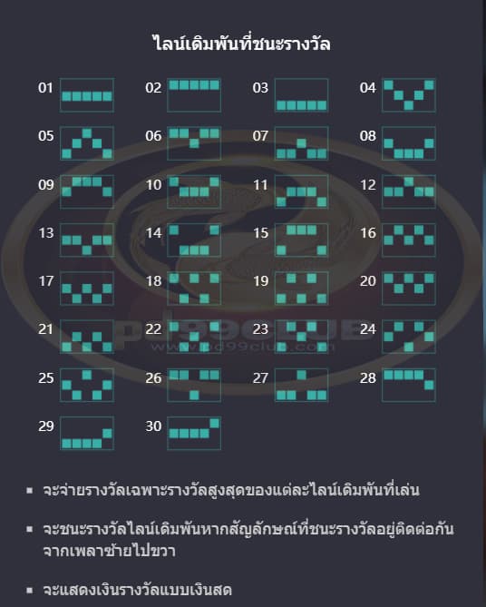 - ไลน์เดิมพันที่ชนะรางวัลมีทั้งหมด 30 ไลน์เดิมพัน