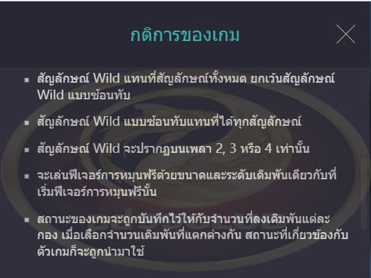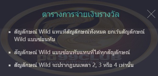 - สัญลักษณ์ Wild แบบซ้อนทับแทนที่ได้ทุกสัญลักษณ์
