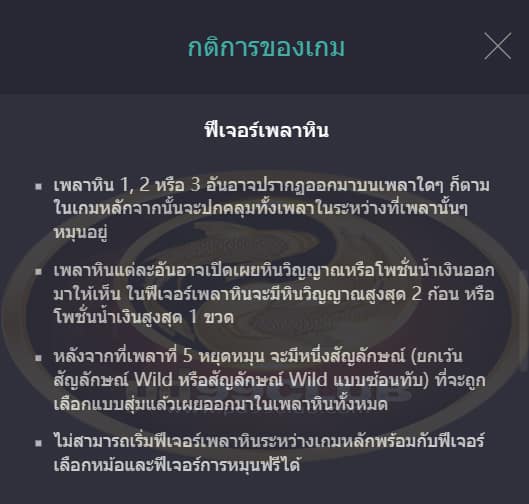 - เมื่อจบฟีเจอร์การหมุนฟรี สัญลักษณ์ที่กลายเป็นหินและสัญลักษณ์ Wild แบบซ้อนทับทั้งหมดที่มีจะไม่เหลื่ออยู่ในการหมุนครั้งถัดไป