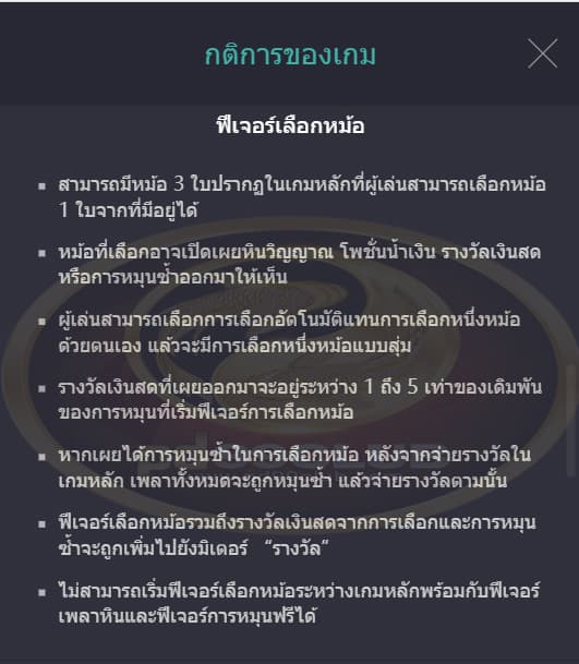 - ฟีเจอร์เลือกหม้อรวมถึงรางวัลเงินสดจากการเลือกเเละการหมุนซํ้าจะถูกเพิ่มไปยังมิเตอร์ “ รางวัล ”