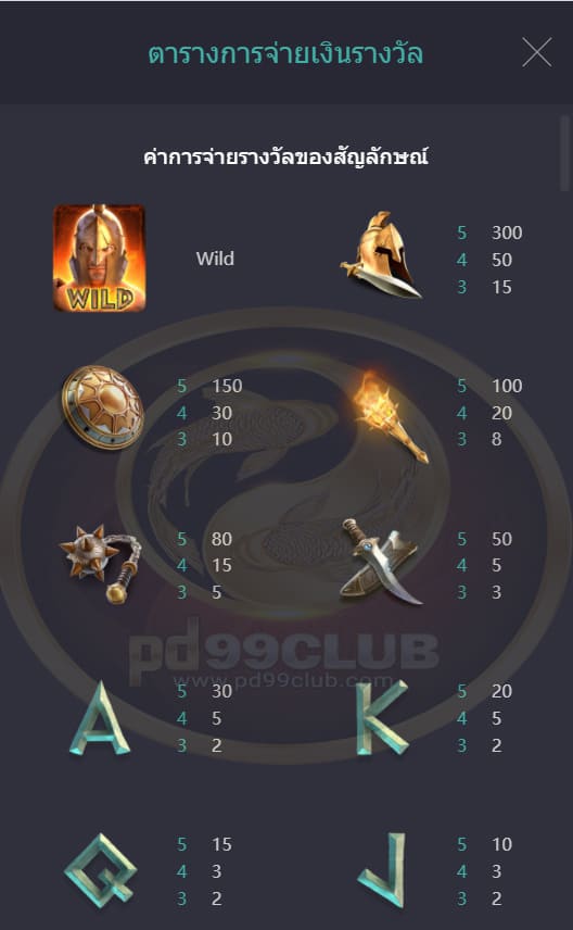 - ค่าการจ่ายรางวัลของสัญลักษณ์มีทั้งหมด 10 สัญลักษณ์