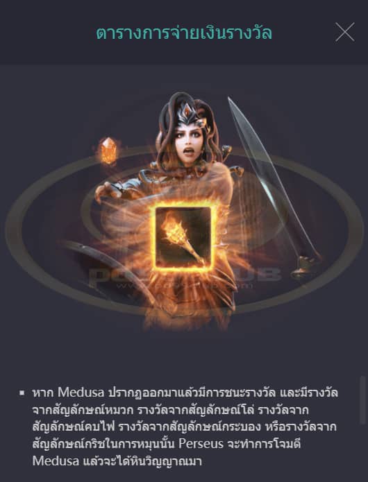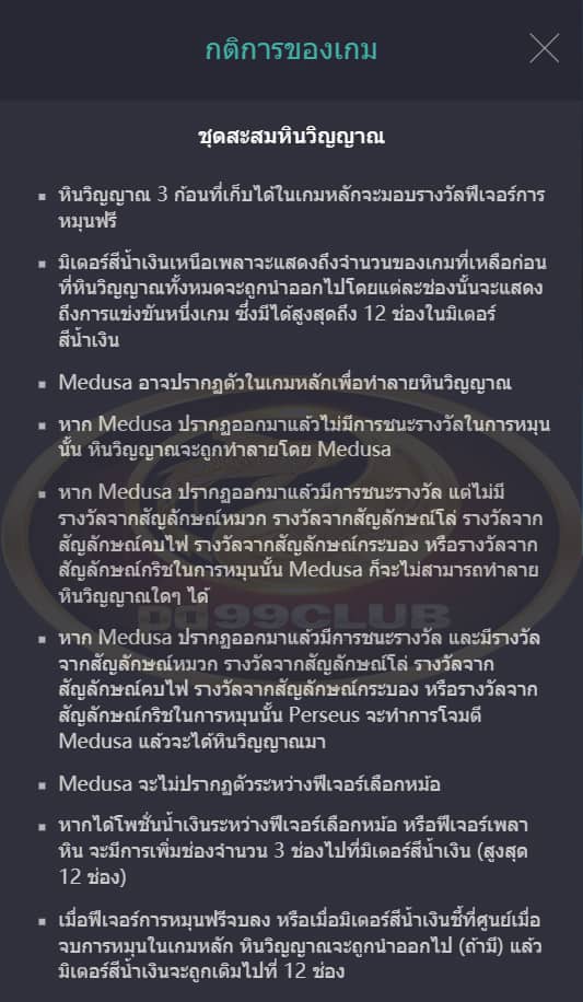 - หาก Medusa ปรากฏออกมาแล้วมีการชนะรางวัล และมีรางวัลจากสัญลักษณ์หมวก รางวัลจากสัญลักษณ์โล่ รางวัลจากสัญลักษณ์คบไฟ รางวัลจากสัญลักษณ์กระบอง หรือรางวัลจากสัญลักษณ์กริชในการหมุนนั้น Perseus จะทำการโจมตี Medusa แล้วจะได้หินวิญญาณมา
