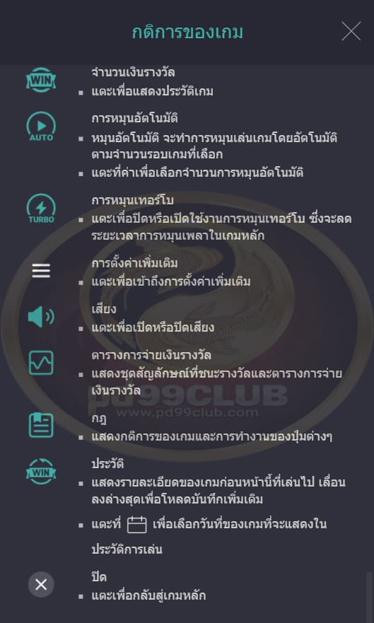 - หมุนอัตโนมัติจะทำการหมุนเล่นเกมโดยอัตโนมัติตามจำนวนรอบเกมที่เลือก