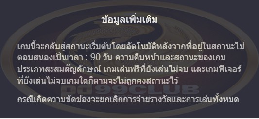 - เกมนี้จะกลับสู่สถานะเริ่มต้นโดยอัตโนมัติหลังจากที่อยู่ในสถานะไม่ตอบสนองเป็นเวลา: 90 วันความคืบหน้าและสถานะของเกมประเภทสะสมสัญลักษณ์เกมเล่นฟรีที่ยังเล่นไม่จบและเกมฟีเจอร์ที่ยังเล่นไม่จบเกมใดก็ตามจะไม่ถูกคงสถานะไว้