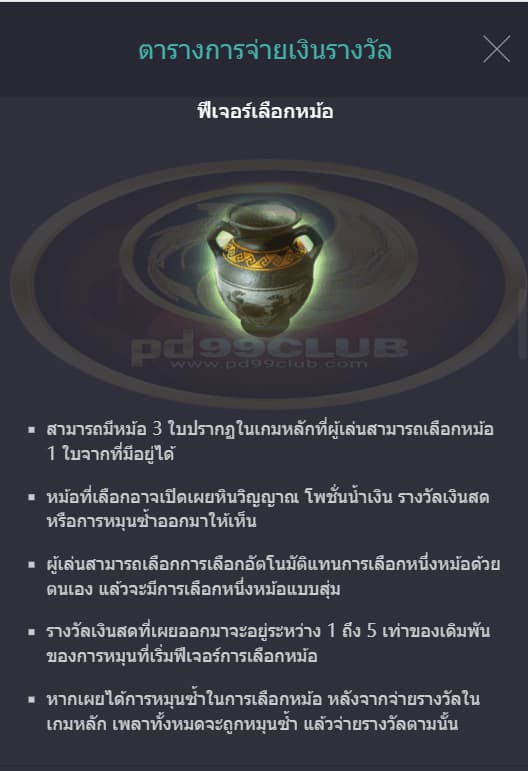 - รางวัลเงินสดที่เผยออกมาจะอยู่ระหว่าง 1 ถึง 5 เท่าของเดิมพันของการหมุนที่เริ่มฟีเจอร์การเลือกหม้อ