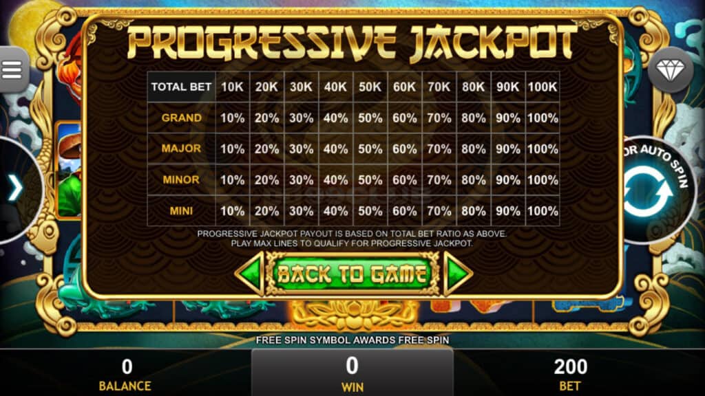 สัญลักษณ์ Progressive Jackpot การจ่ายเงินแจ็คพอตแบบก้าวหน้าขึ้นอยู่กับอัตราส่วนการเดิมพันทั้งหมดที่กล่าวมา เล่น MAX LINES เพื่อคุณสมบัติสำหรับแจ็คพอตที่ก้าวหน้า