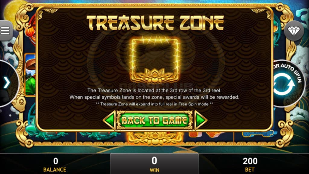 สัญลักษณ์ Treasure Zone ตั้งอยู่ที่แถวที่ 3 ของวงล้อที่ 3 เมื่อสัญลักษณ์พิเศษตกลงบนโซนจะได้รับรางวัลพิเศษ ** Treasure Zone จะขยายเป็นรีลเต็มในโหมด Free Spin **