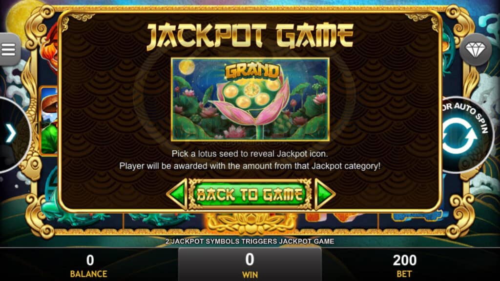 สัญลักษณ์ Jackpot Game เลือกเม็ดบัวเพื่อแสดงไอคอนแจ็คพอต ผู้เล่นจะได้รับรางวัลเป็นจำนวนเงินจากหมวดแจ็คพอตนั้น!
