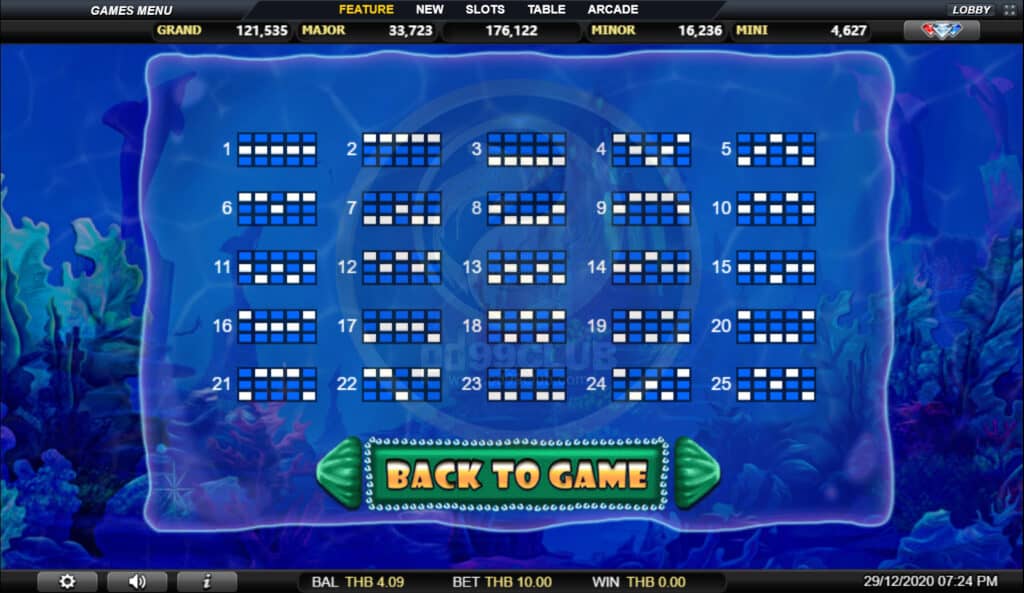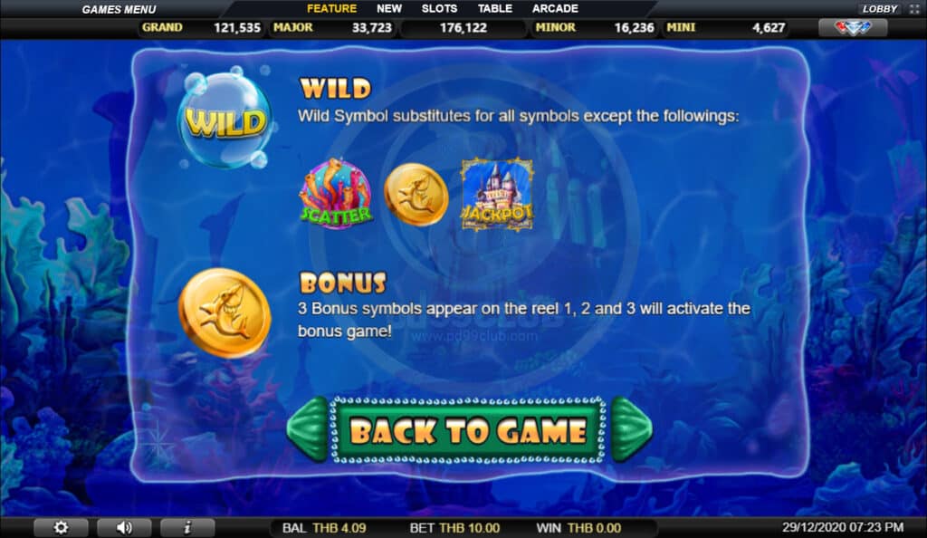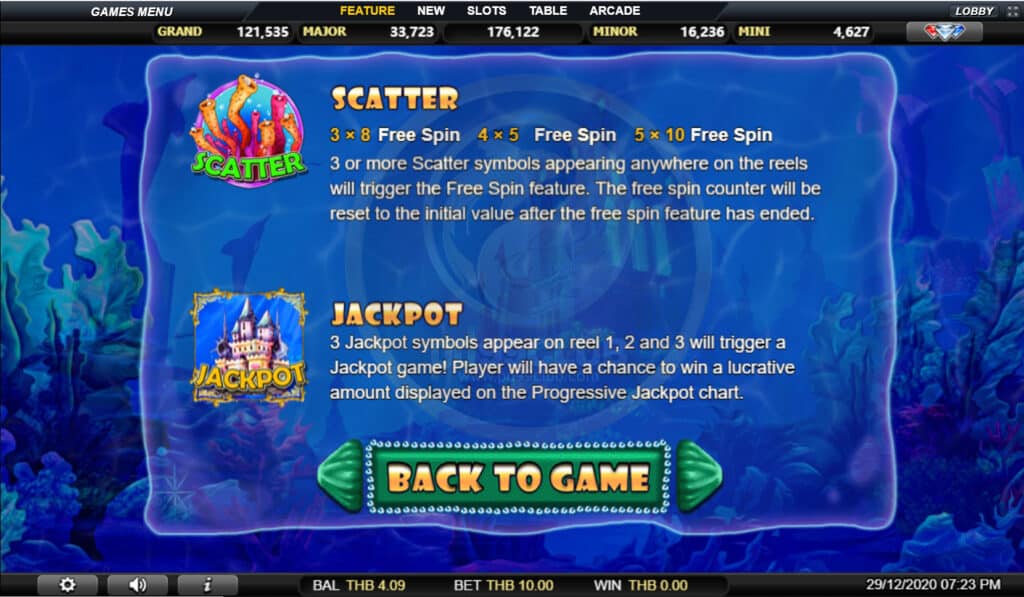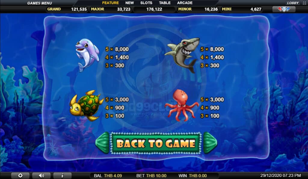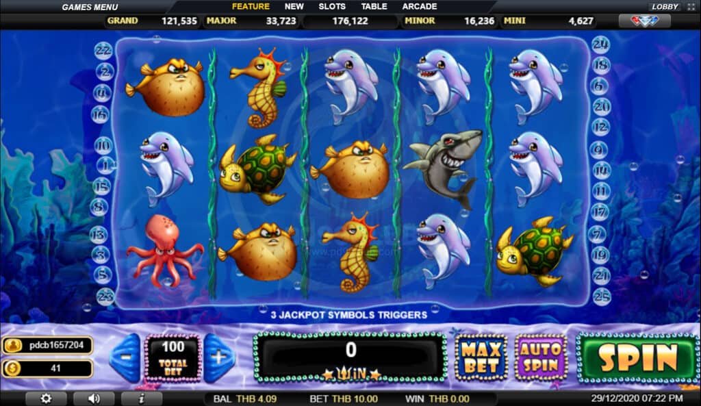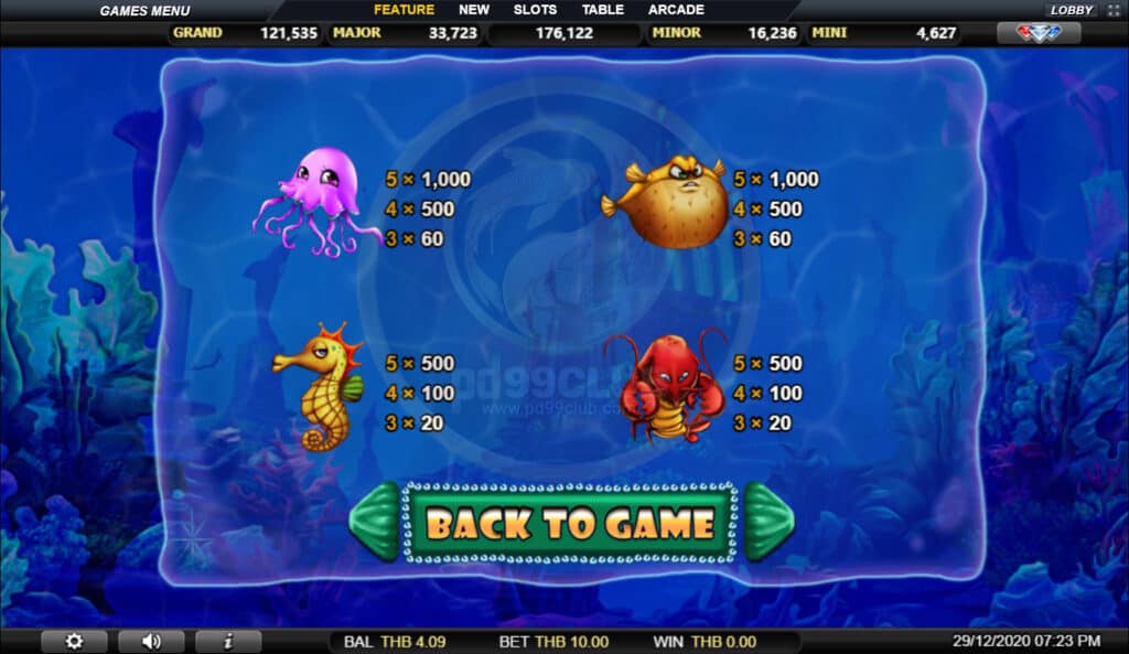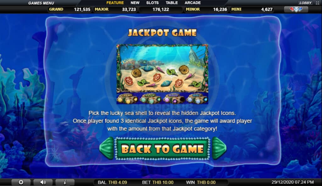 สัญลักษณ์ Jackpot Game เลือกเปลือกหอยนำโชคเพื่อเปิดเผยไอคอนแจ็คพอตที่ซ่อนอยู่ เมื่อผู้เล่นพบไอคอนแจ็คพอตที่เหมือนกัน 3 ไอคอนเกมจะมอบรางวัลให้กับผู้เล่นด้วยจำนวนเงินจากหมวดแจ็คพอตนั้น!