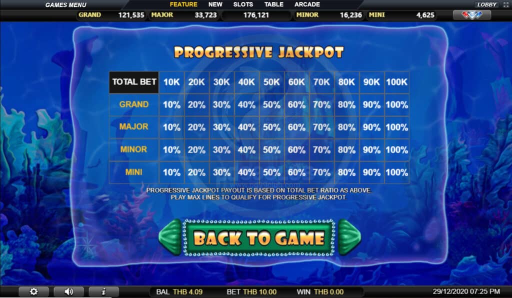 สัญลักษณ์ Progressive Jackpot การจ่ายเงินแจ็คพอตแบบก้าวหน้าขึ้นอยู่กับอัตราส่วนการเดิมพันทั้งหมดข้างต้นเล่นเส้นสูงสุดเพื่อให้มีคุณสมบัติเหมาะสมสำหรับแจ็คพอตแบบก้าวหน้า