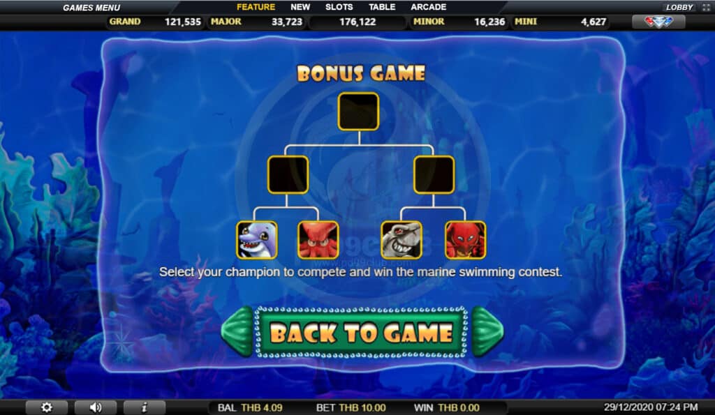 สัญลักษณ์ Bonus Game เลือกแชมป์ของคุณเพื่อแข่งขันและชนะการแข่งขันว่ายน้ำทางทะเล