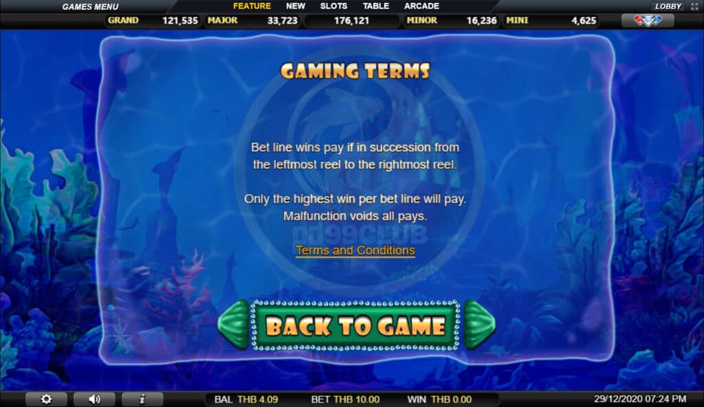 กฏกติกา เงื่อนไขการเล่นเกมสายการเดิมพันชนะการจ่ายเงินหากต่อเนื่องกันจากรีลซ้ายสุดไปยังรีลขวาสุด เฉพาะผู้ชนะสูงสุดต่อบรรทัดเดิมพันเท่านั้นที่จะจ่าย ความผิดปกติเป็นโมฆะการจ่ายเงินทั้งหมด