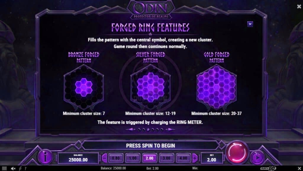 - Wisdom – อัปเกรดสัญลักษณ์ศูนย์กลางเป็นสัญลักษณ์ที่มีการจ่ายสูงใดก็ได้หรือ Wild ก่อนที่คุณลักษณะ Forged Ring จะเกิดขึ้น