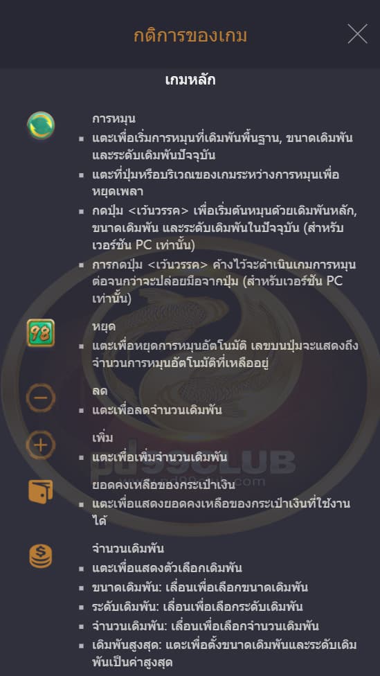 กดปุ่ม เพื่อเริ่มหมุนที่การเดิมพันพื้นฐานขนาดเดิมพันและระดับการเดิมพันปัจจุบัน (ใช้ได้กับเวอร์ชั่น PC เท่านั้น)