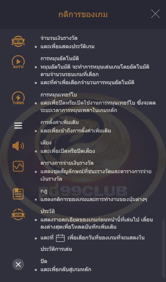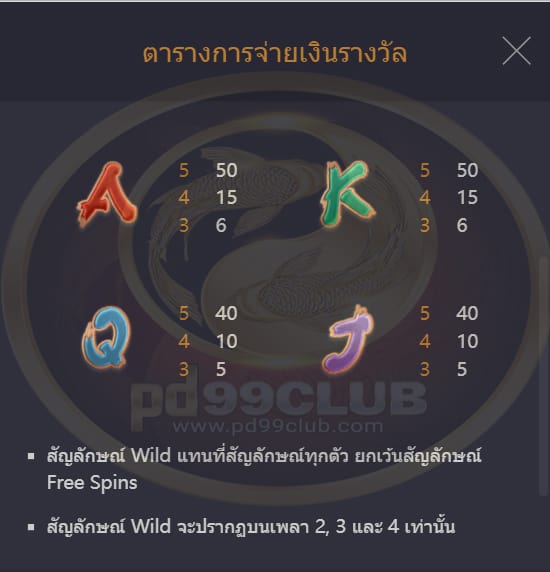 จะแสดงชุดสัญลักษณ์ที่ชนะและตารางการจ่ายเงิน