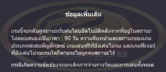 เกมนี้จะกลับสู่สถานะเริ่มต้นโดยอัตโนมัติหลังจากที่อยู่ในสถานะไม่ตอบสนองเป็นเวลา: 90 วันความคืบหน้าและสถานะของเกมประเภทสะสมสัญลักษณ์เกมเล่นฟรีที่ยังเล่นไม่จบและเกมฟีเจอร์ที่ยังเล่นไม่จบเกมใดก็ตามจะไม่ถูกคงสถานะไว้