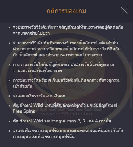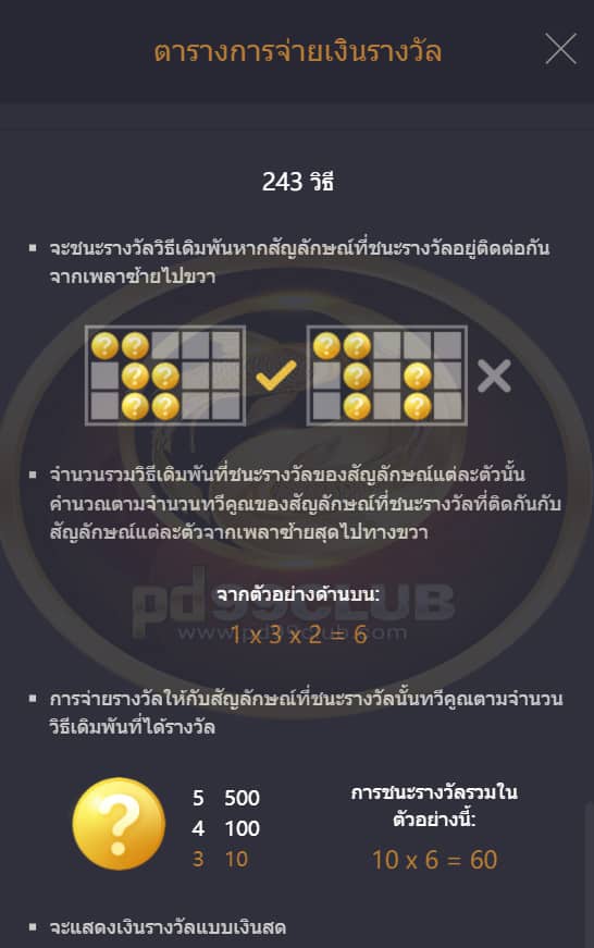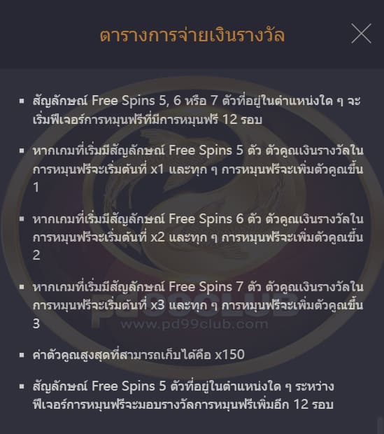 รางวัลจากไลน์เดิมพันจะเท่ากับจำนวนที่เเสดงใน “ ตารางการจ่ายเงินรางวัล ” คูณด้วยขนาดเดิมพันเเละระดับเดิมพัน
