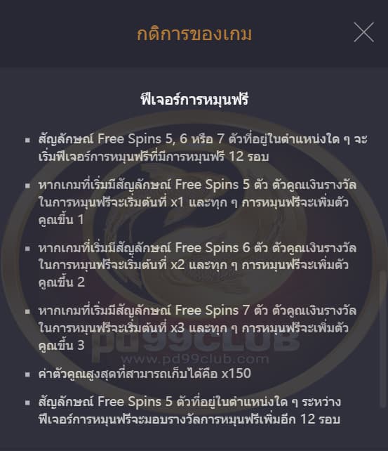 จะเล่นฟีเจอร์การหมุนฟรีด้วยขนาดและระดับเดิมพันเดียวกับที่เริ่มฟีเจอร์การหมุนฟรีนั้น