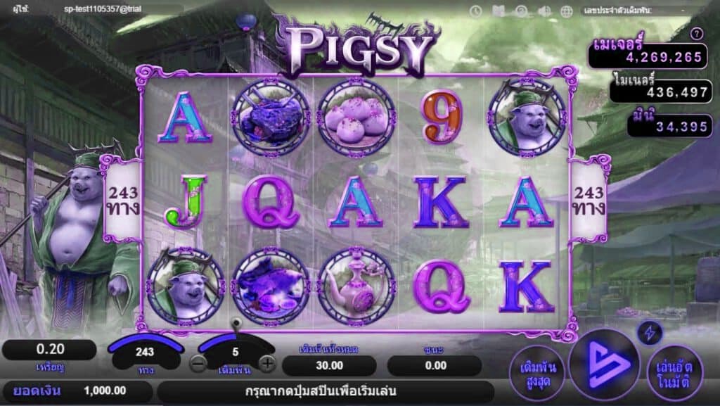 เกมสล็อต Pigsy เป็นเกมสล็อตออนไลน์แนวผจญภัยที่เขานั้นได้เดินทางไปยังชมพูทวีป(อินเดีย) เพื่ออัญเชิญพระพุทธศาสนาของหลวงจีนชื่อพระถังชำจั๋ง ถูกในนำมาพัฒนาเป็นเกมสล็อตโดย mgm111 ที่อ้างอิงจากผู้มีตัวตนจริงในประวัติศาสตร์ซึ่งระหว่างการเดินทางต้องพบกับการขัดขวางของเหล่าปีศาจมากมาย เมื่อเข้าหมุนสล็อตก็จะรู้สึกถึงความอุดมสมบูรณ์ตวามเก่งกาจ และความสำราญใจตลอดเวลาในเกมสล็อตเกมนี้คุณจะได้พบกับหมูตือโป๊ยก่ายที่จะมาเป็นผู้นำโชคในการสร้างโบนัสให้กับคุณได้อย่างแน่นอน จากนี้ยังมีตัวละครอีกมากมายที่จะมาสร้างเงินโบนัสที่จะทวีคูณในเงินเดิมพันของคุณอีกมากมายเกมสล็อตเกมนี้เป็นเกมที่เล่นง่าย มีเสียงเพลงประกอบที่จะทำให้เกิดความเพลิดเพลินระหว่างการเล่นได้อย่างแน่นอน มีภาพกราฟฟิกที่สวยงามลักษณะของเกมเป็นเกมที่เล่นได้ง่ายๆเพียงแค่กดเล่นหมุนสปินตัวเกมก็จะทำการหมุน และหยุดเมื่อถึงเวลาจากนั้นก็เตรียมรอรับเงินโบนัสที่จะเกิดขึ้นได้เลย