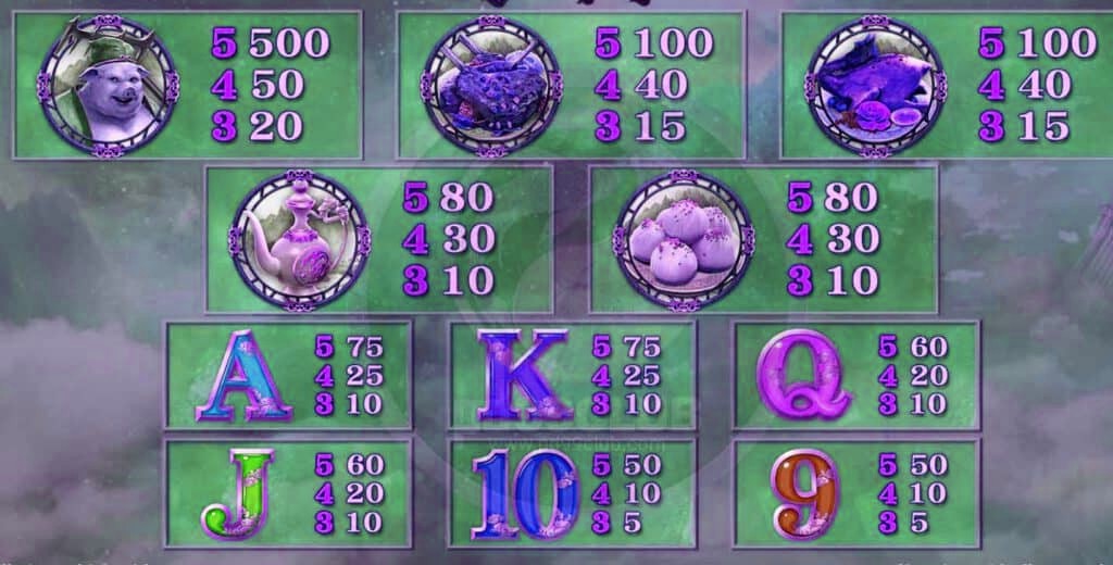 - สัญลักษณ์อักษร Q-J ติดกัน 3 ตัว อัตราการจ่ายเงินรางวัลที่คูณ 10 หากออกติดกัน 4 ตัว คูณ 20 หากออกติดกัน 5 ตัวคูณ 60