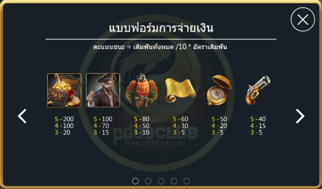 มีทั้งหมด 6 สัญลักษณ์ คะแนนชนะ=เดิมพันมั้งหมด/10*อัตราเดิมพัน