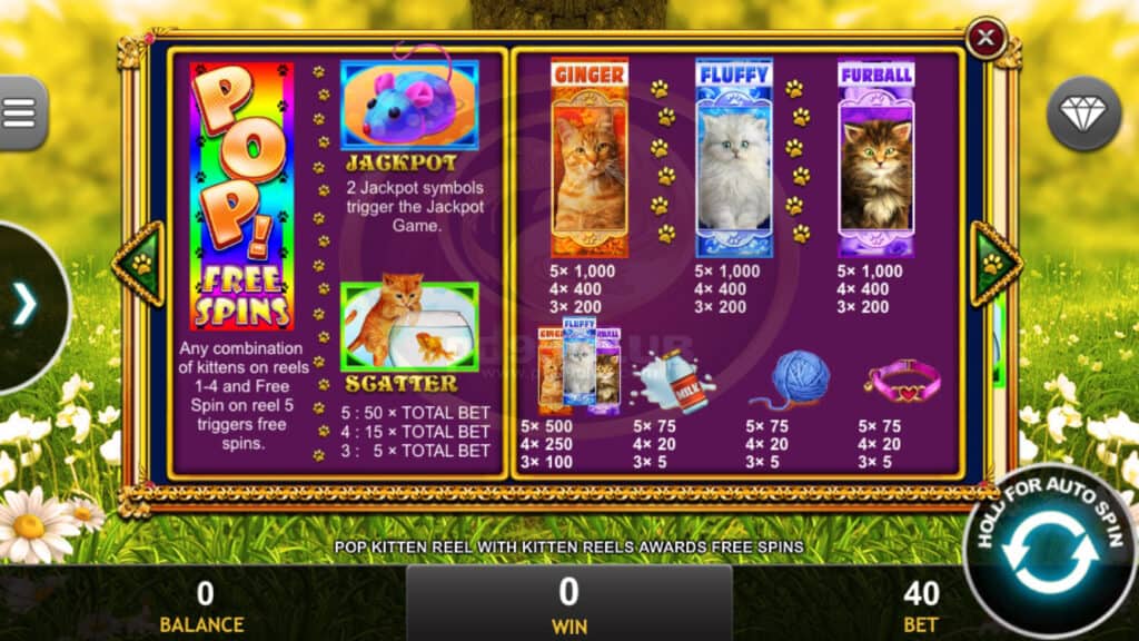 สัญลักษณ์ Pop Free Spins ลูกแมวตัวใดก็ได้ในวงล้อ 1-4 และ Free Spin บนรีล 5 จะได้รับทริกเกอร์ฟรีสปิน