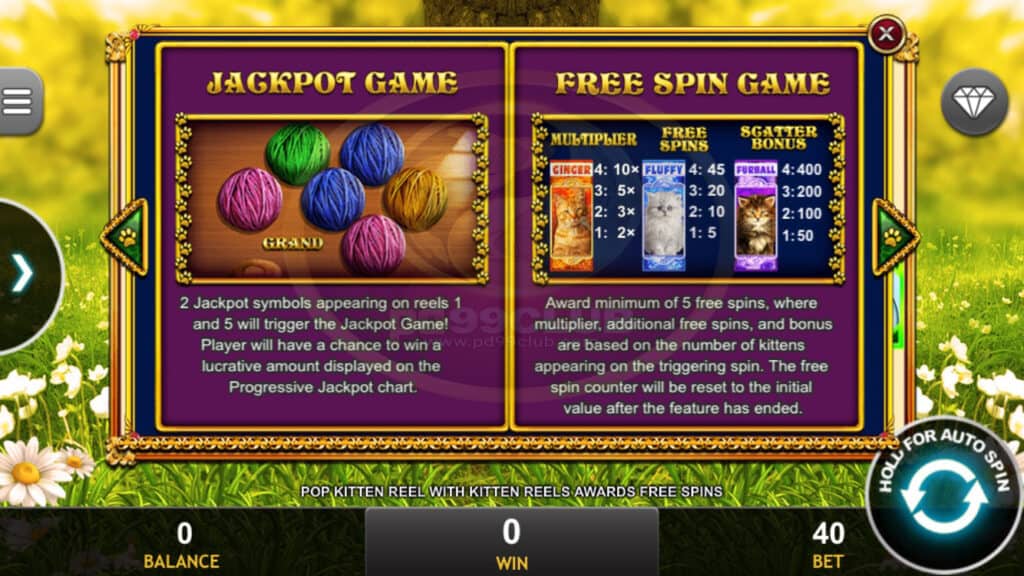 สัญลักษณ์ Free Spin Game ขึ้นอยู่กับจำนวนรางวัลลูกแมวที่มีผู้เล่นหลายคน 9 คนการหมุนฟรีเพิ่มเติมและโบนัสที่ปรากฏในการหมุนทริกเกอร์ ตัวนับการหมุนฟรีจะถูกรีเซ็ตเป็นค่าเริ่มต้น