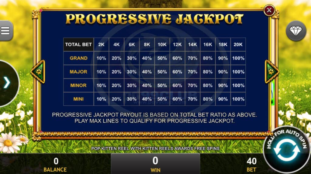 สัญลักษณ์ Progressive Jackpot การจ่ายเงินแจ็คพอตแบบก้าวหน้าขึ้นอยู่กับอัตราส่วนการเดิมพันทั้งหมดที่กล่าวมา เล่น MAX LINES เพื่อรับแจ็คพอตที่มีคุณภาพ