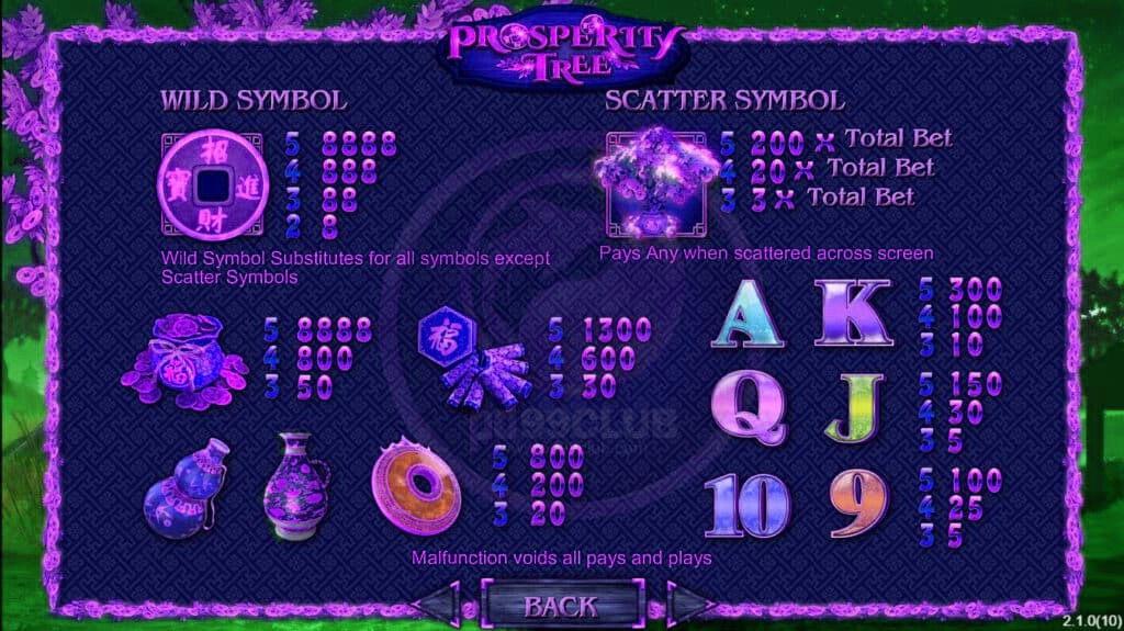 อัตราการจ่ายสัญลักษณ์สัญลักษณ์กระจาย ติดกัน 3 ตัว อัตราการจ่ายเงินรางวัลที่คูณ 3Xเดิมพันทั้งหมด หากออกติดกัน 4 ตัว คูณ 20Xเดิมพันทั้งหมด หากออกติดกัน 5 ตัวคูณ 200Xเดิมพันทั้งหมด