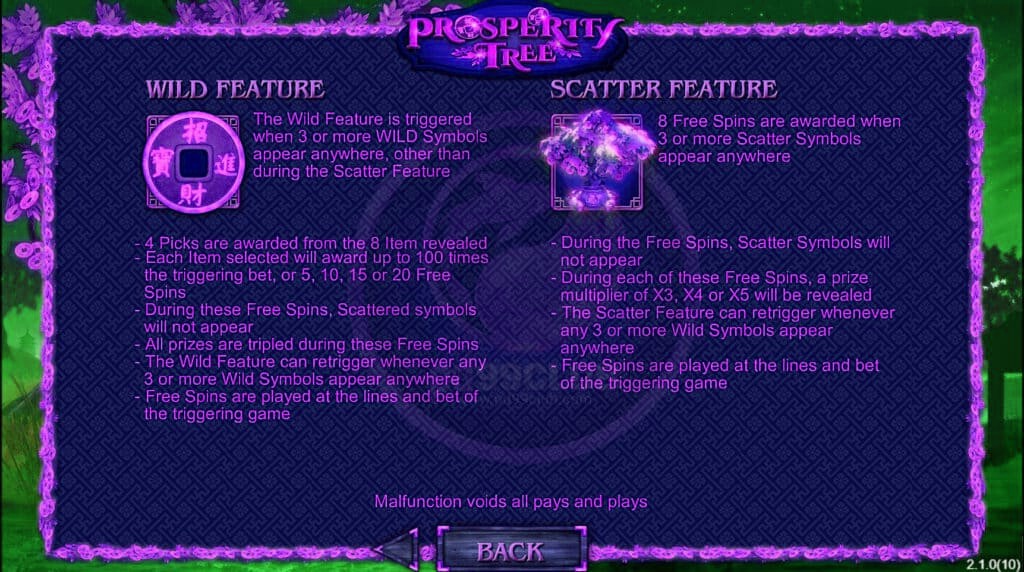 - เเต่ละรายการที่เลือกจะให้รางวัลสูงสุด 100 คูณกับเดิมพันของรอบที่เกิดฟีเจอร์ 5 , 10 , 15 หรือ 20 ฟรีสปิน