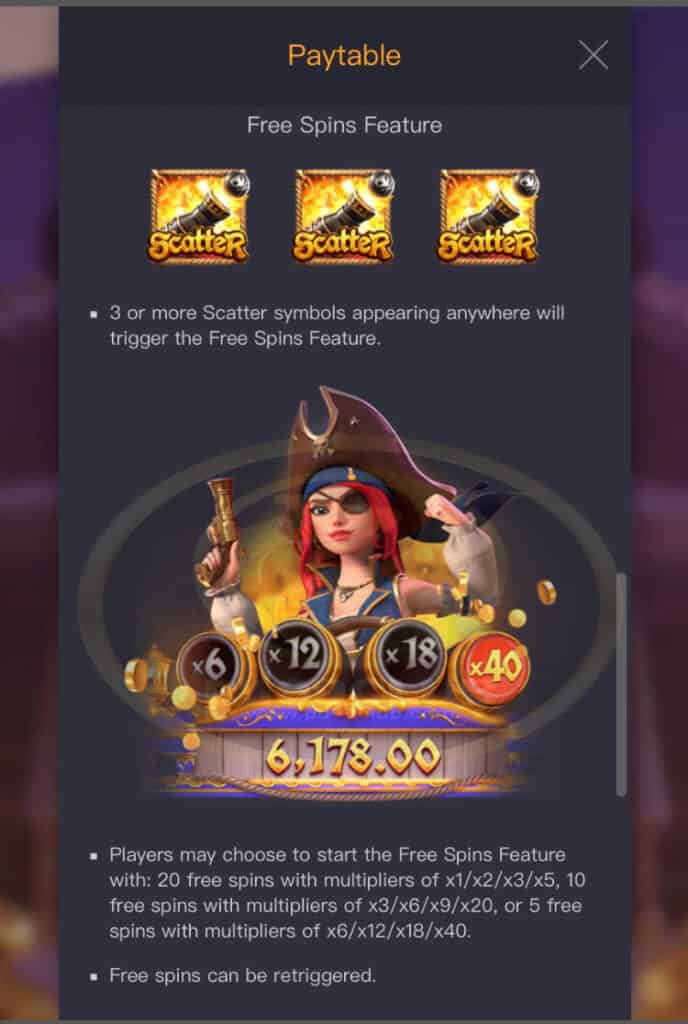 - ฟีเจอร์ฟรีสปินมีสัญลักษณ์กระจาย 3 ตัวขึ้นไปปรากฏขึ้นที่ใดก็ได้จะเรียกใช้คุณสมบัติฟรีสปิน