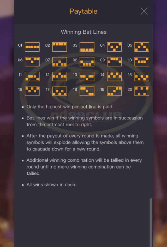 - บรรทัดเดิมพันที่ชนะเป็นเงินสดจะเท่ากับมูลค่าที่แสดงใน “Paytable” คูณด้วยขนาดเดิมพันและระดับการเดิมพัน