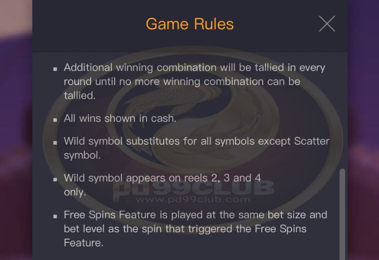 - ฟีเจอร์ฟรีสปินเล่นในขนาดเดิมพันและระดับการเดิมพันเดียวกันกับการหมุนที่เรียกใช้ฟีเจอร์ฟรีสปิน