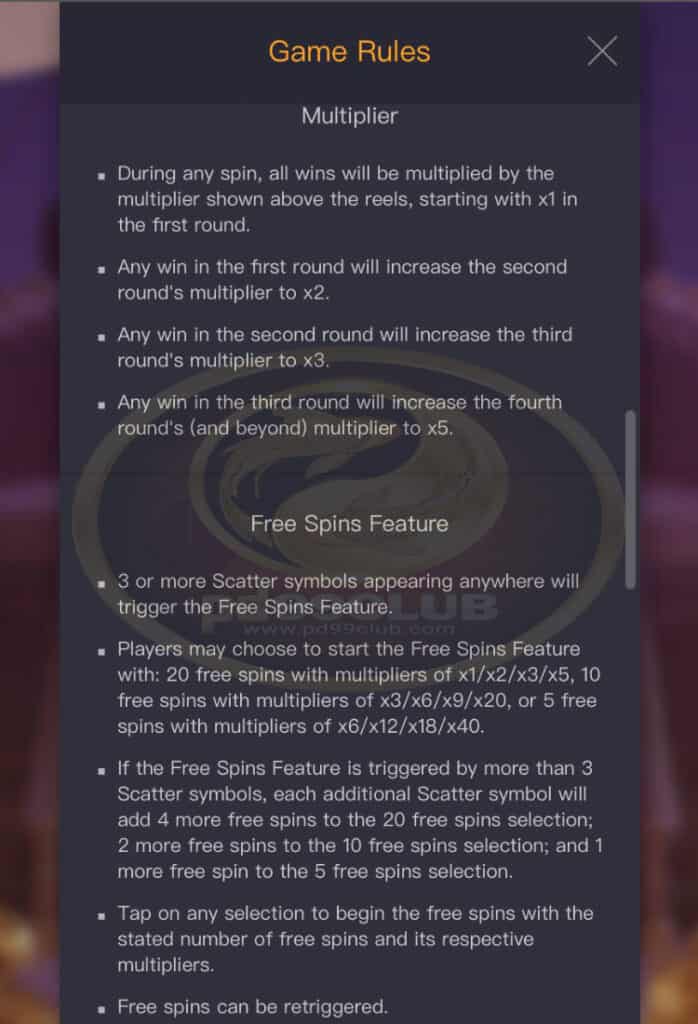 - สัญลักษณ์กระจาย 3 ตัวขึ้นไปที่ปรากฏที่ใดก็ได้จะเรียกใช้คุณลักษณะฟรีสปิน