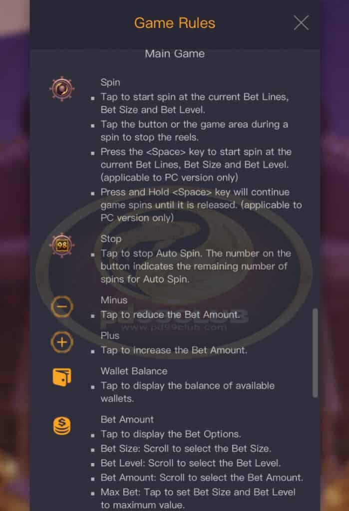 - กดปุ่ม เพื่อเริ่มหมุนที่เส้นเดิมพันปัจจุบันขนาดเดิมพันและระดับการเดิมพัน (ใช้ได้กับเวอร์ชั่น PC เท่านั้น)
