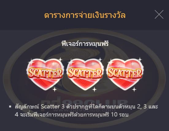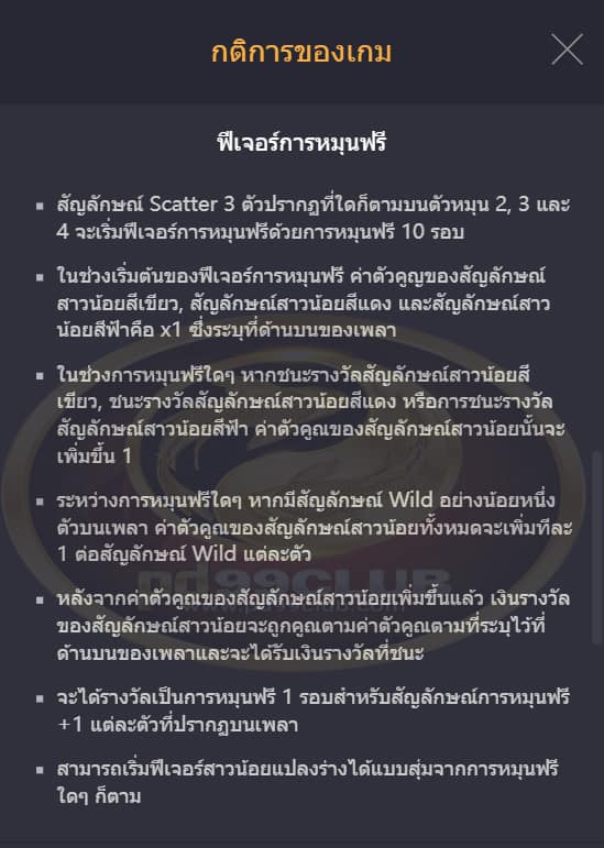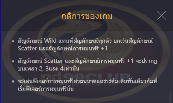 จะเล่นฟีเจอร์การหมุนฟรีด้วยขนาดและระดับเดิมพันเดียวกันกับการหมุนที่เริ่มฟีเจอร์การหมุนฟรีนั้น