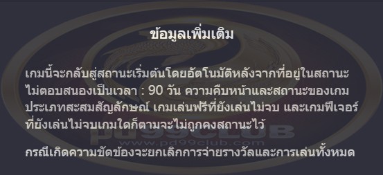 เกมนี้จะกลับสู่สถานะเริ่มต้นโดยอัตโนมัติหลังจากที่อยู่ในสถานะไม่ตอบสนองเป็นเวลา: 90 วันความคืบหน้าและสถานะของเกมประเภทสะสมสัญลักษณ์เกมเล่นฟรีที่ยังเล่นไม่จบและเกมฟีเจอร์ที่ยังเล่นไม่จบเกมใดก็ตามจะไม่ถูกคงสถานะไว้