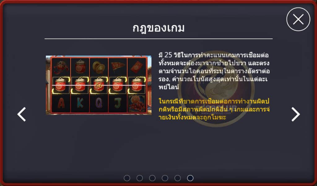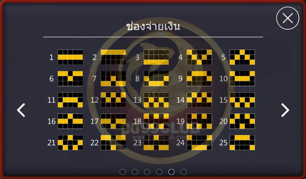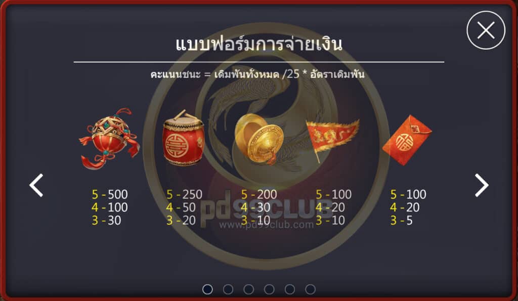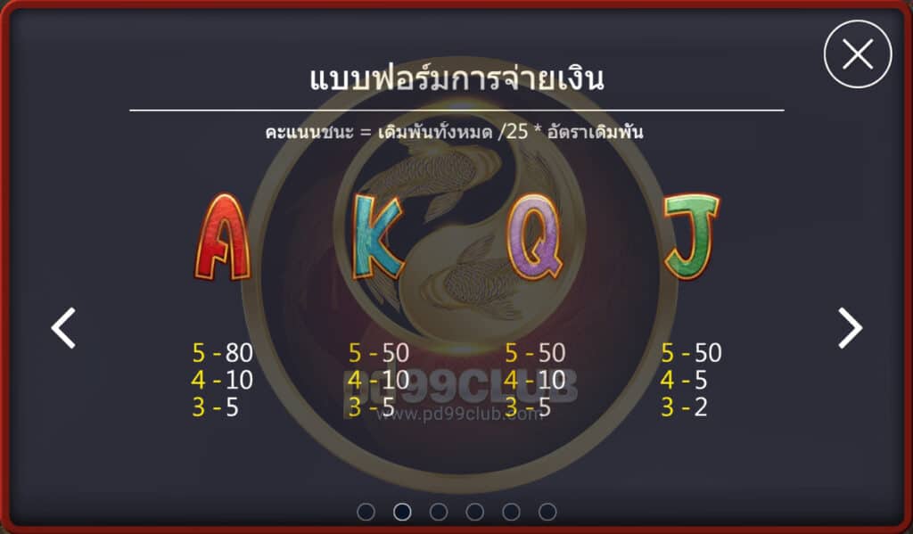 มีทั้งหมด 9 สัญลักษณ์ คะแนนชนะ=เดิมพันทั้งหมด/25*อัตราเดิมพัน