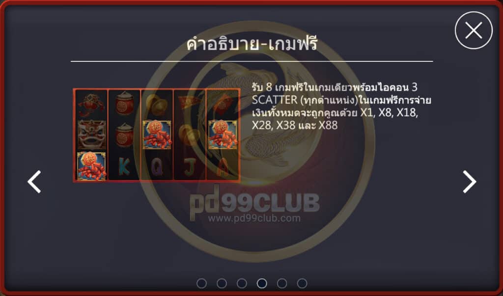 รับ 8 เกมฟรีในเกมเดียวกัน พร้อมไอคอน 3 Scatter (ทุกตำแหน่ง) ในเกมฟรี การจ่ายเงินทั้งหมด จะถูกคูณด้วย x1, x8, x28, x38, และ x88